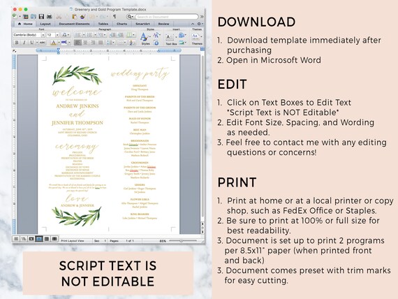 Wedding Program Template Greenery Leaves Gold Text Font Etsy