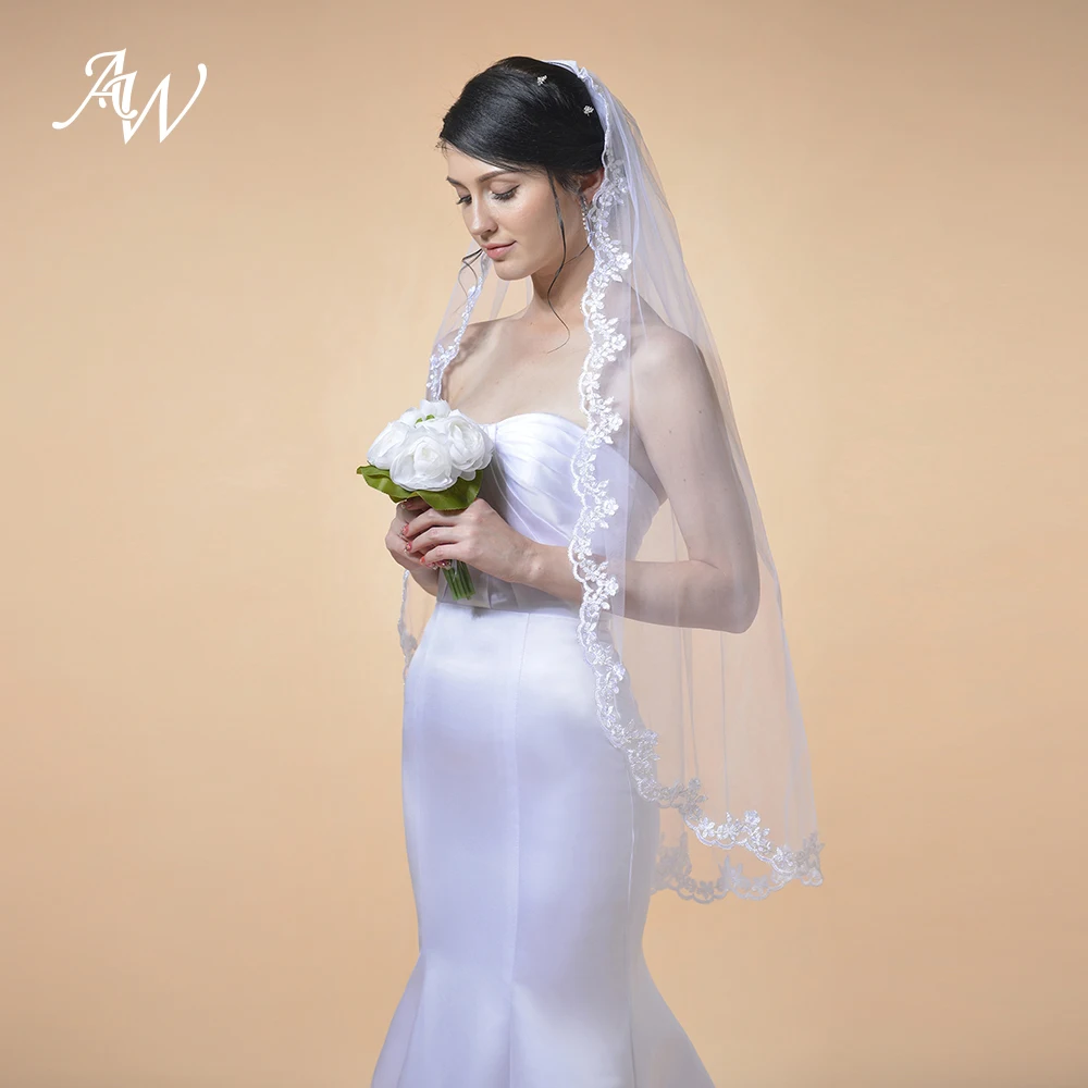 Aw 1 Tier Bridal Veil With Lace Wedding Veil Floral Hem And Comb