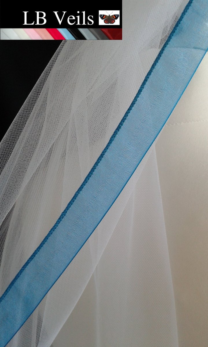 Blue Wedding Veil 2 Tier Ribbon Edge Hip Waist Length Pink Red