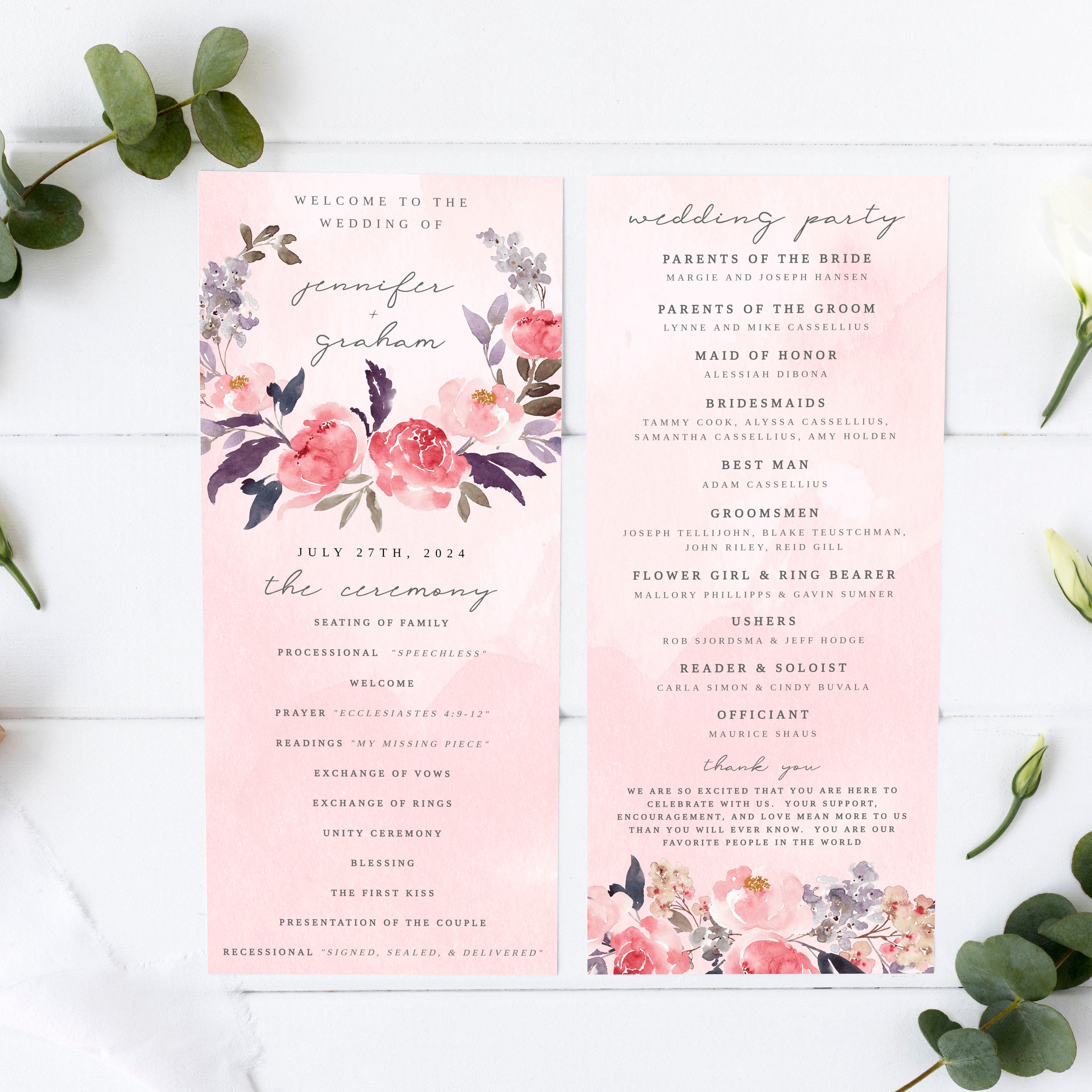 Printable Blush Pink Floral Double Sided Long Wedding Program