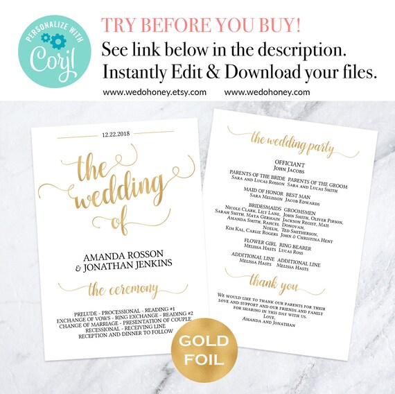 Gold Wedding Program Wedding Template Double Sided Program Etsy