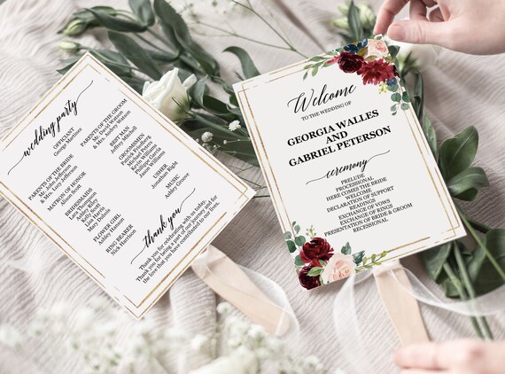 Burgundy Wedding Program Fans Template Personalized Wedding Etsy
