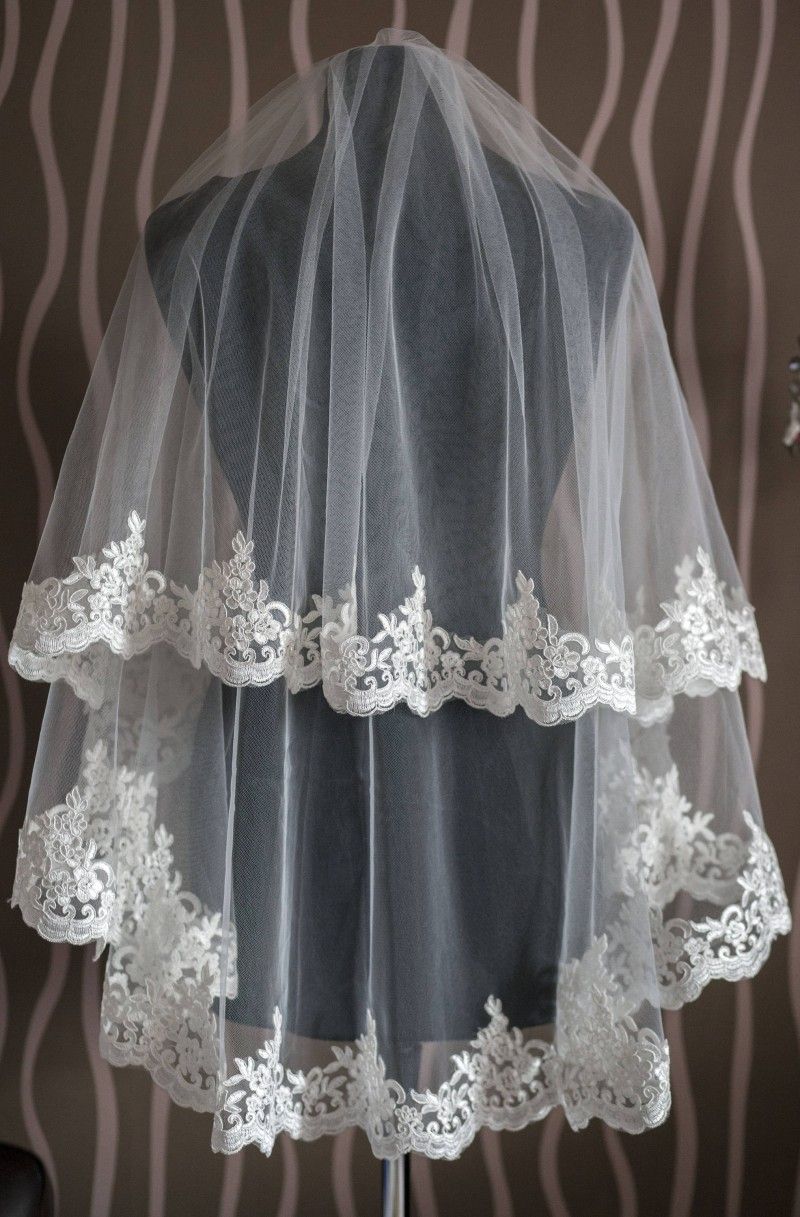 Cheap Short Two Layer Bridal Veils Fingertip Length Lace Applique