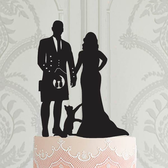 Scottish wedding cake topper bride and groom with kilt silhouette wedding cake toppers with dog groom wears kilt custom cake topper. Cheeky wedding cake topper.
